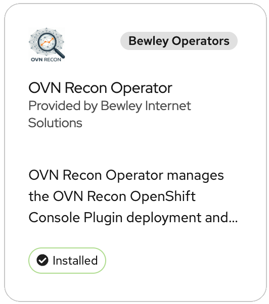 Unless and until OVN Recon is added to the community operators catalog, you can install my CatalogSource to make it available in the “Operator Hub”, which has recently been rebranded as “Ecosystem / Software Catalog” in the OpenShift Console.