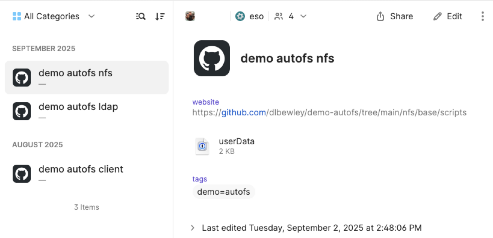 vault=eso for vm in client ldap nfs; do op item edit \ --vault "$vault" \ --url "https://github.com/dlbewley/demo-autofs/tree/main/${vm}/base/scripts" \ "demo autofs $vm" \ "userData[file]=${vm}/base/scripts/userData" done